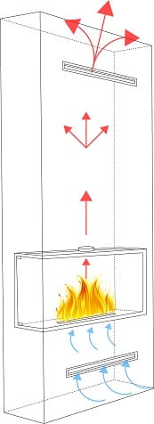 Wystarczy, że w zabudowie, pod i nad biokominkiem zostaną zamontowane kratki wentylacyjne (typu luft lub tunel). Na górze biokominka znajduje się otwór o średnicy 100mm, można go połączyć z górną kratką wentylacyjną, jednakże połączenie nie jest konieczne. Ważne by w zabudowie była pusta przestrzeń, aby ciepło mogło swobodnie przepływać.