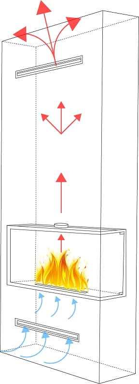 Wystarczy, że w zabudowie, pod i nad biokominkiem zostaną zamontowane kratki wentylacyjne (typu luft lub tunel). Na górze biokominka znajduje się otwór o średnicy 100mm, można go połączyć z górną kratką wentylacyjną, jednakże połączenie nie jest konieczne. Ważne by w zabudowie była pusta przestrzeń, aby ciepło mogło swobodnie przepływać.