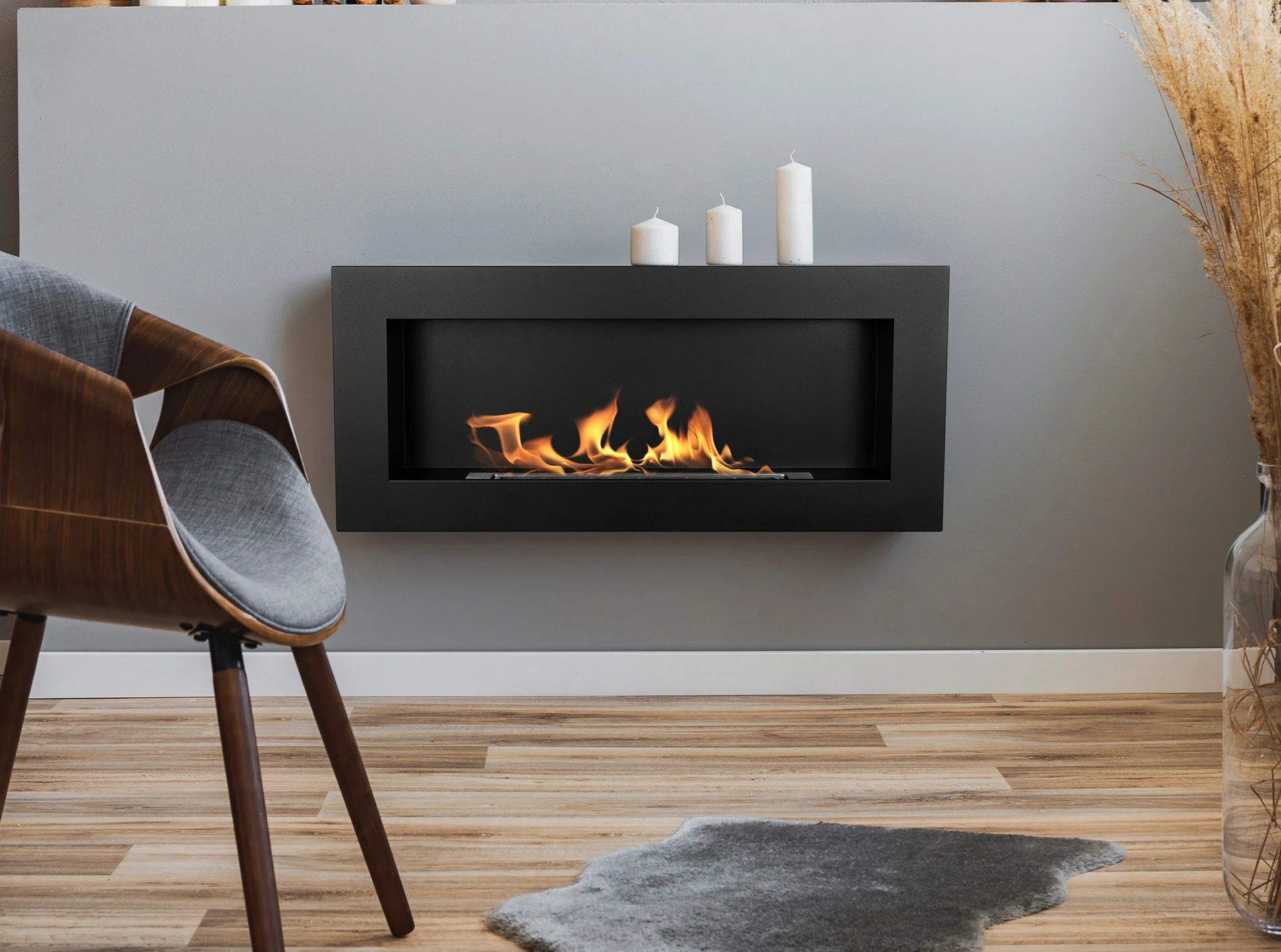 Biokominek wiszący 900x400 Box wystarczy przymocować do ściany w dowolnym miejscu, bez podłączania do komina! Doskonale sprawdzi się jako ozdoba, którą