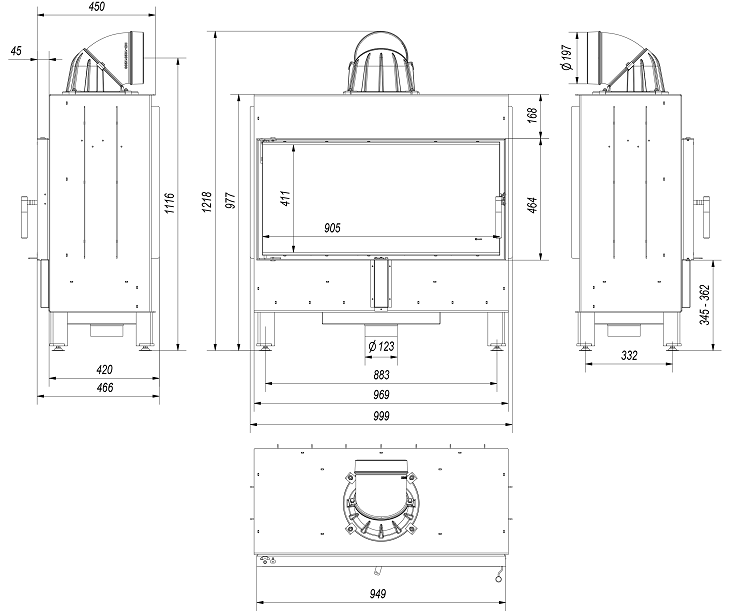 Potrójny system dopowietrzenia komory spalania: powietrze pierwotne - doprowadzone pod ruszt; powietrze wtórne dostarczane jest otworami w tylnej ścianie. Dodatkowo we wkładzie zastosowany jest system czystej szyby (kurtyna powietrza).