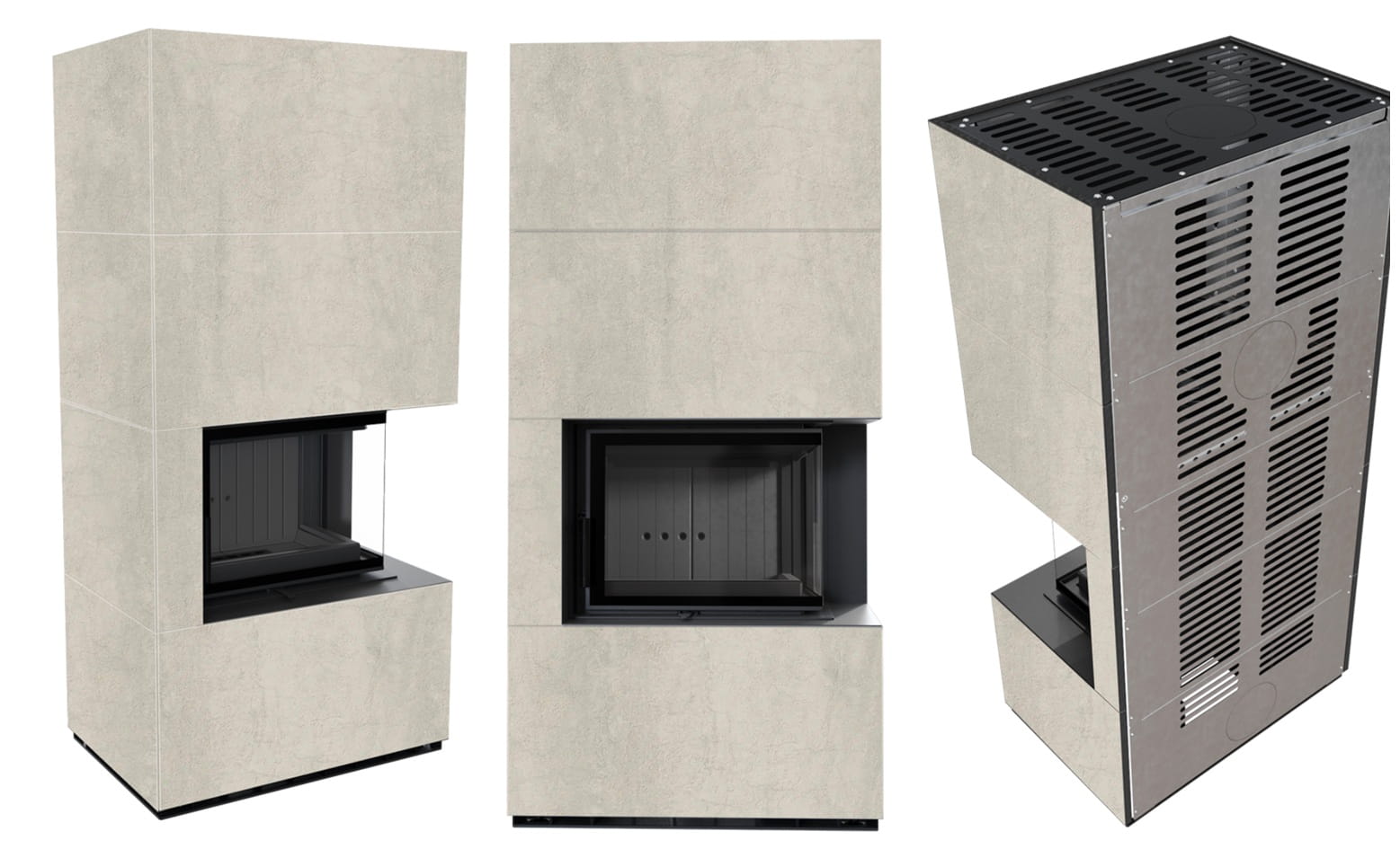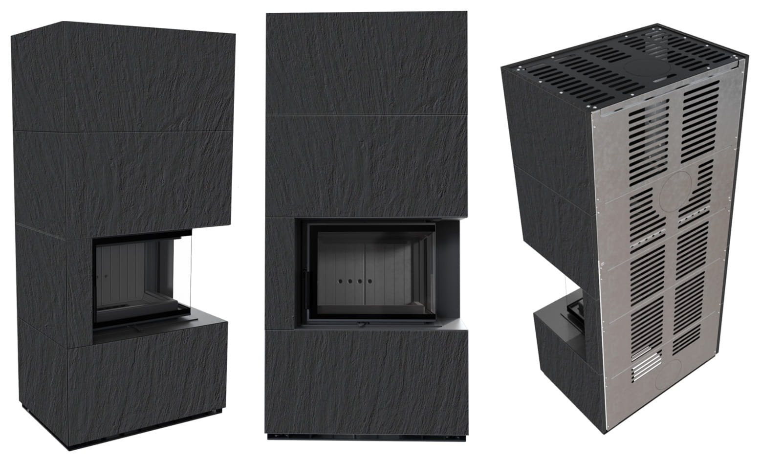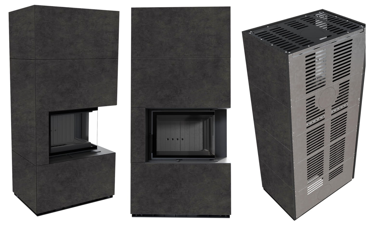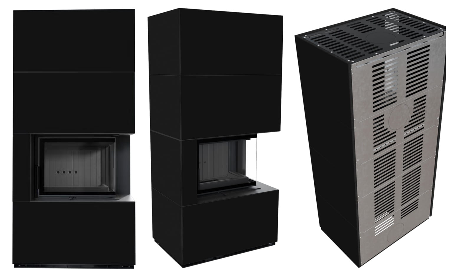 Kominek modułowy powietrzny stalowy Floki S BOX prawy z czarnym termotec w zabudowie ze spieku, wylot fi 160, moc 8 kW