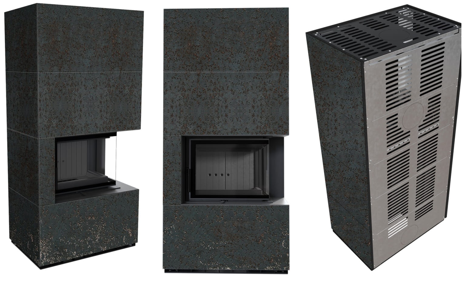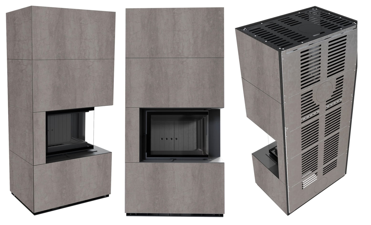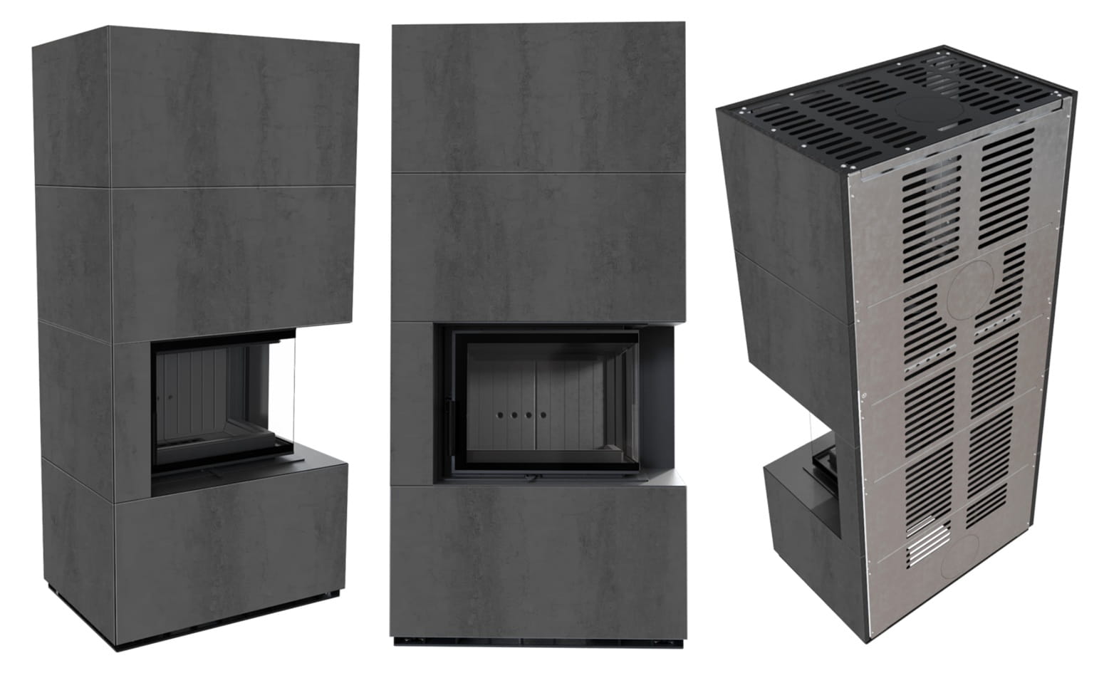 Kominek modułowy powietrzny stalowy Floki S BOX prawy z czarnym termotec w zabudowie ze spieku, wylot fi 160, moc 8 kW