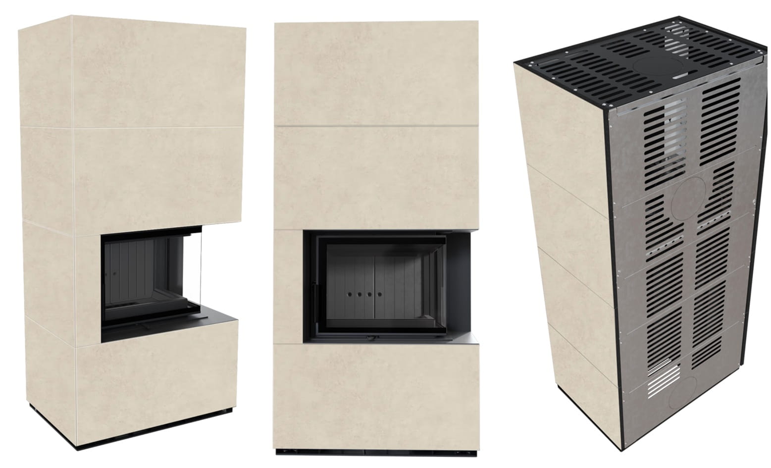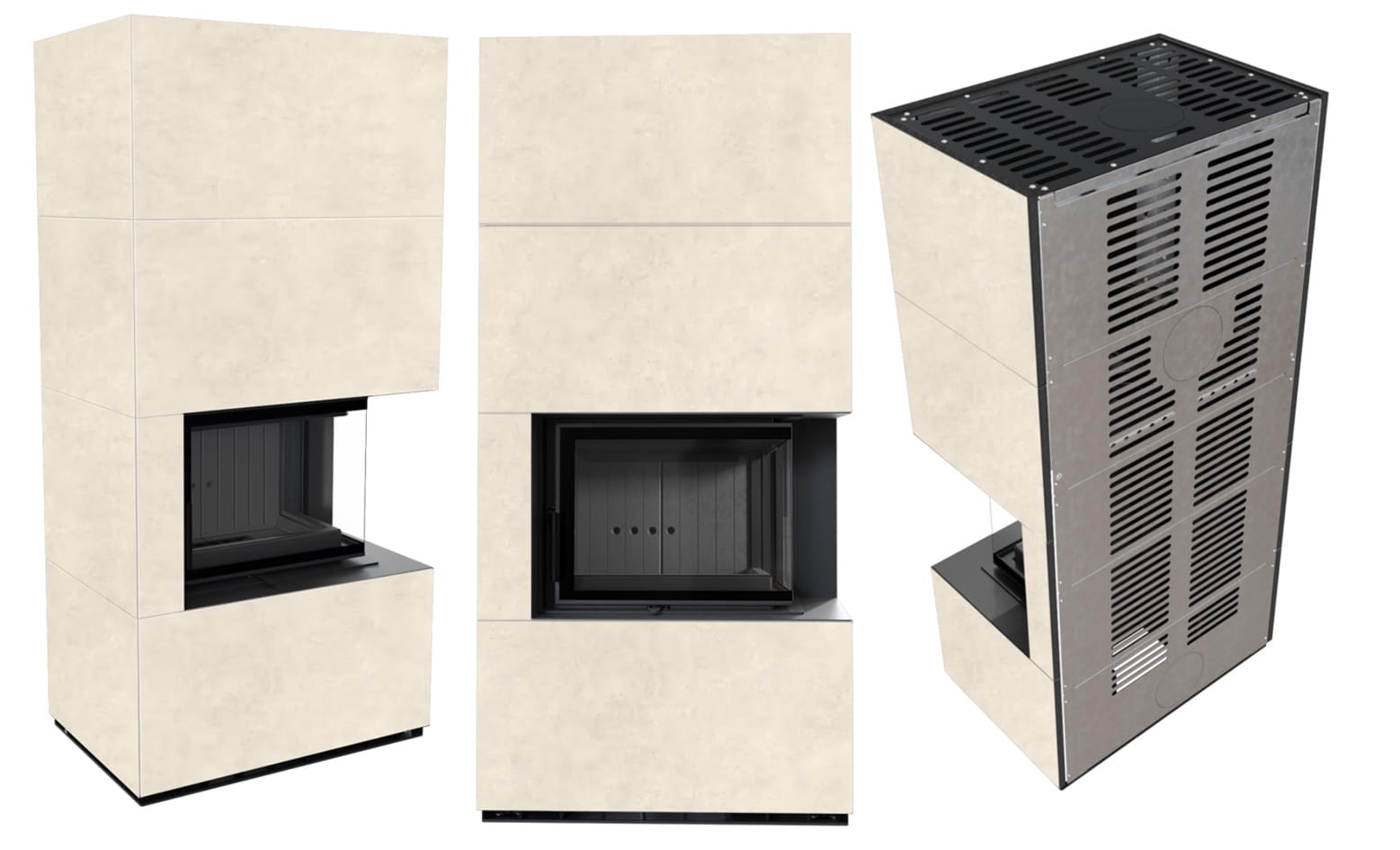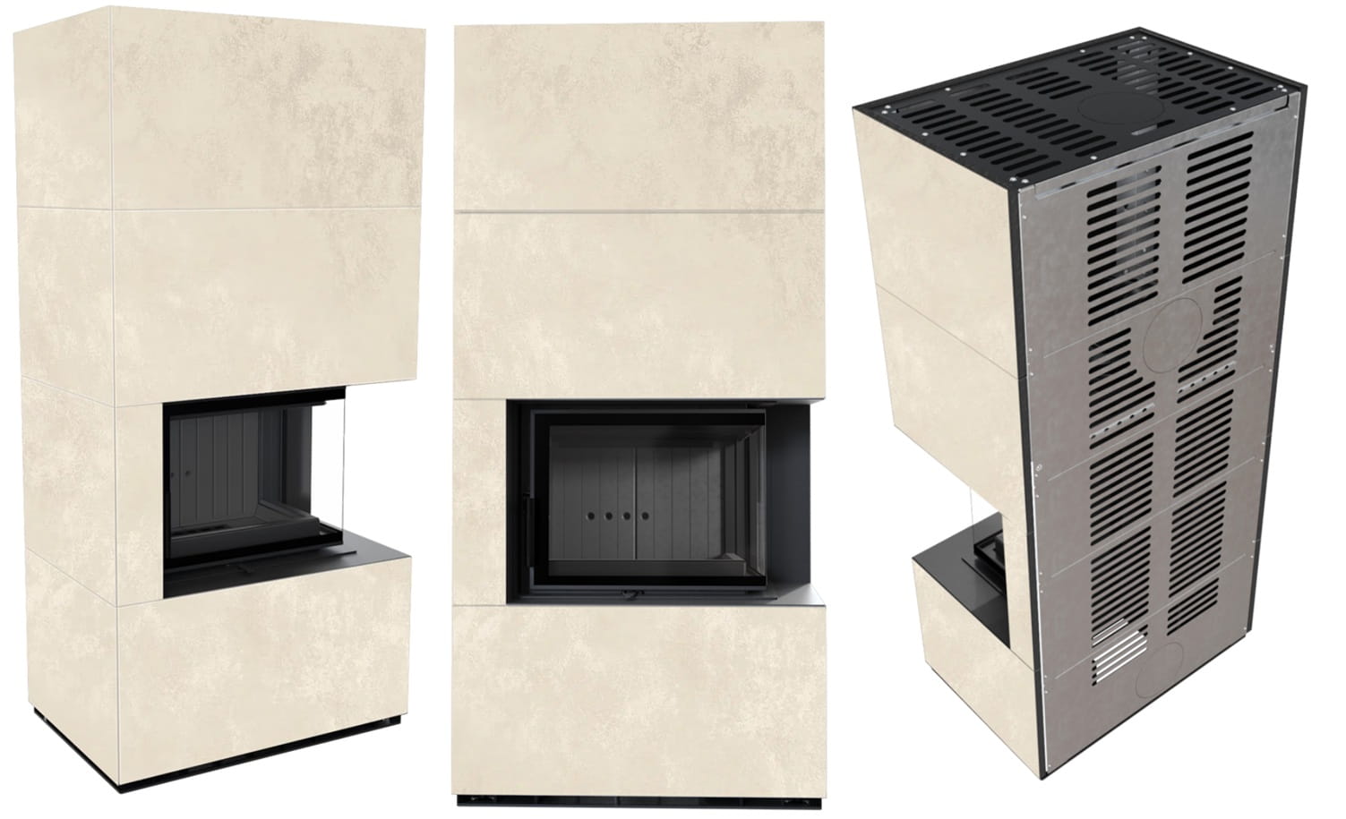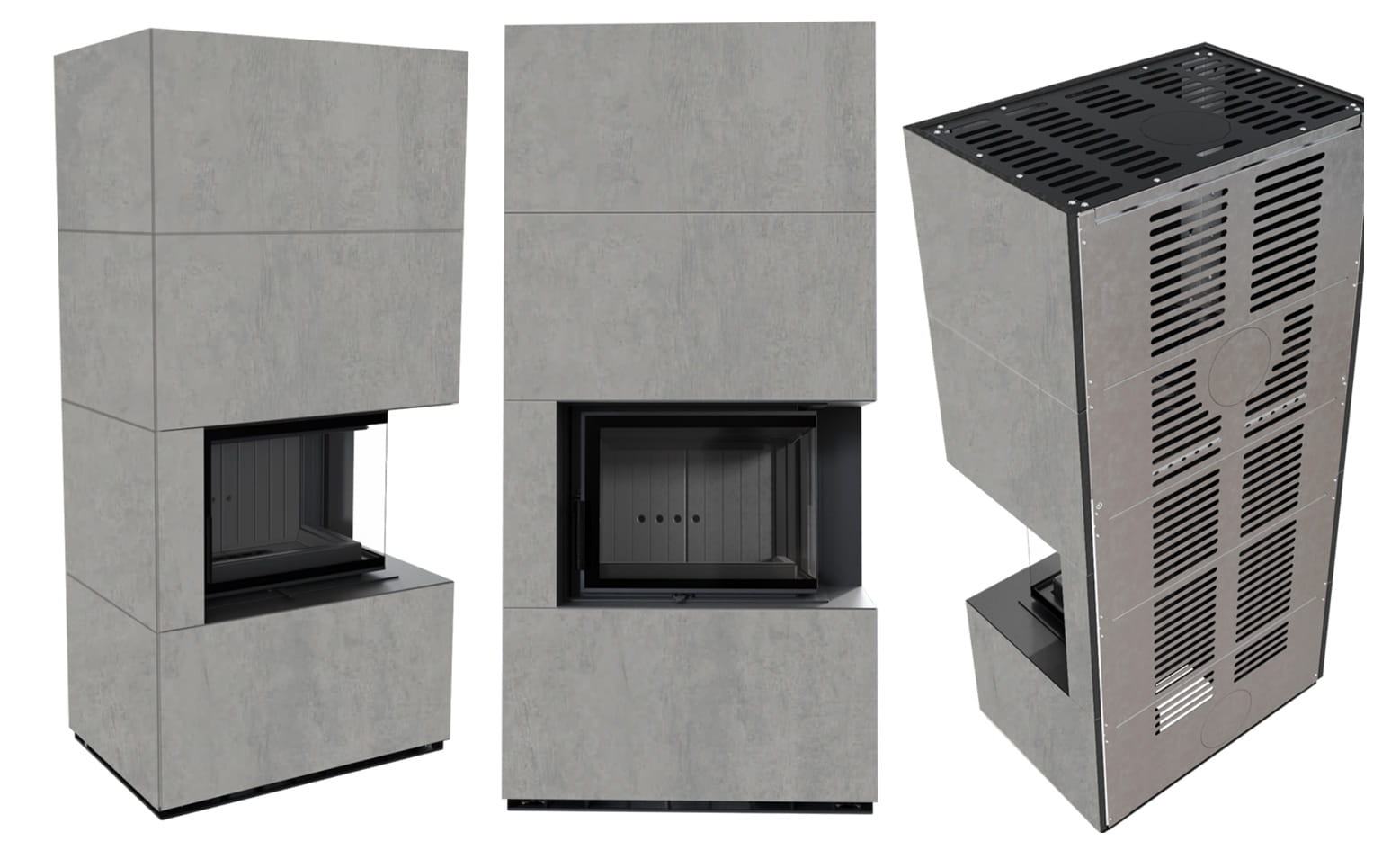 Kominek modułowy powietrzny stalowy Floki S BOX prawy z czarnym termotec w zabudowie ze spieku, wylot fi 160, moc 8 kW