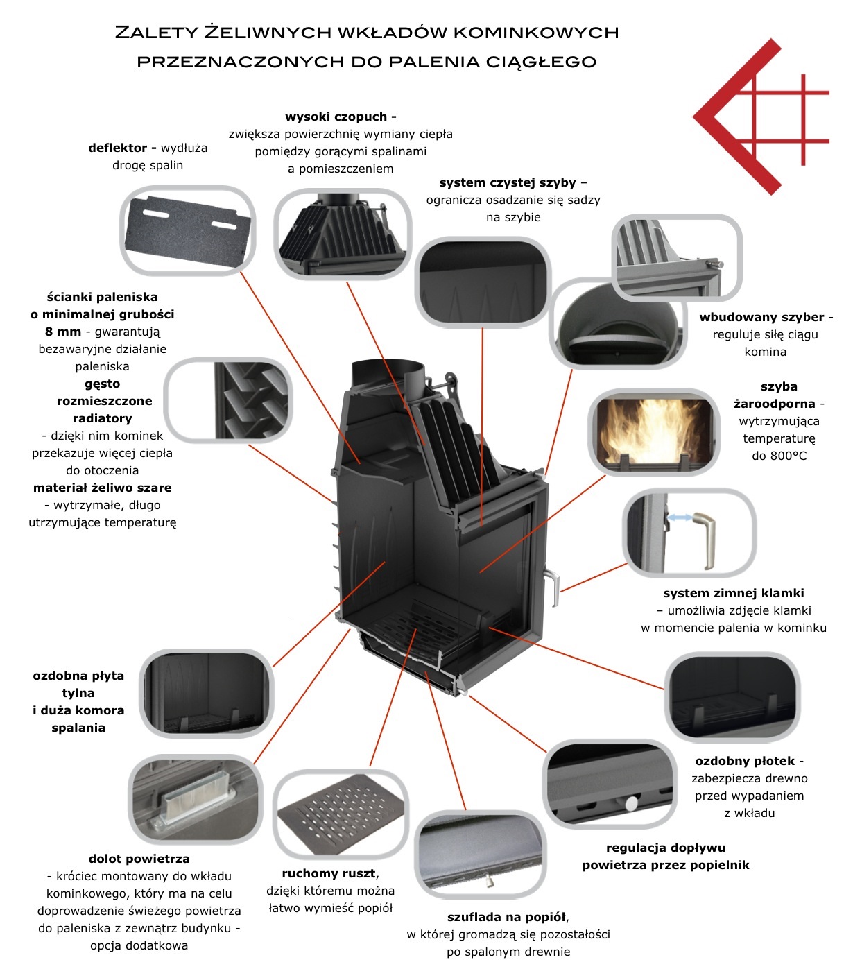 Maksymalne wykorzystanie ciepła dzięki gęsto rozmieszczonym radiatorom oraz ściankom paleniska wykonanym z wysokiej jakości żeliwa o grubości 8 mm.