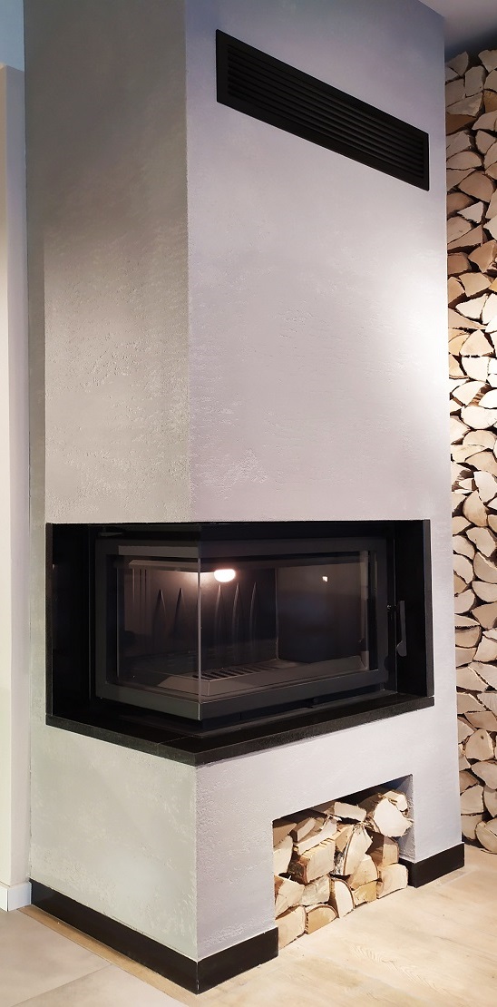 Przykładowa aranżacja, z użyciem czarnego gładkiego granitu pozwala uzyskać efekt wkładu wsuniętego wewnątrz obudowy. Blacik pod wkładem jest bardzo praktyczny, a kamienne boczki uzupełniają tworząc ciekawy efekt, chroniąc by obudowa nie brudziła się podczas czynności związanych z paleniem, otwieraniem drzwiczek, łapaniem za klamkę.