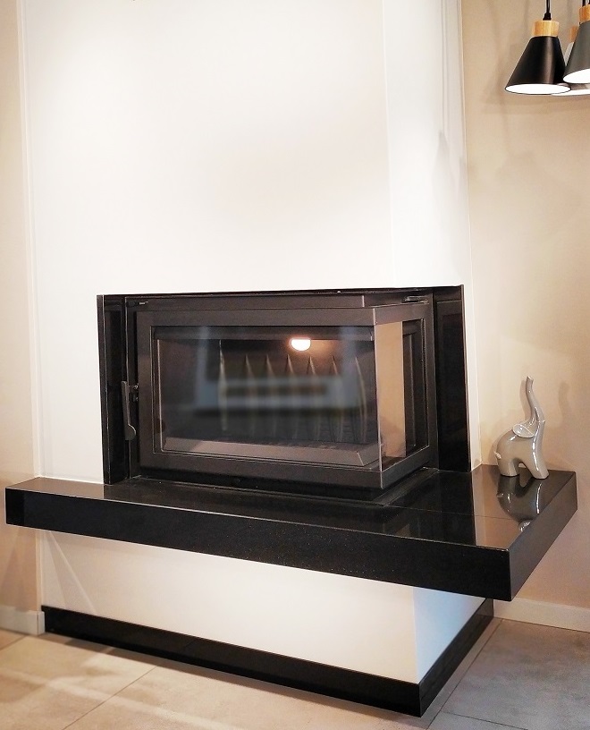 Narożny wkład kominkowy o drzwiach typu BS (szyby łączone), wyposażony w pojedynczą szybę.