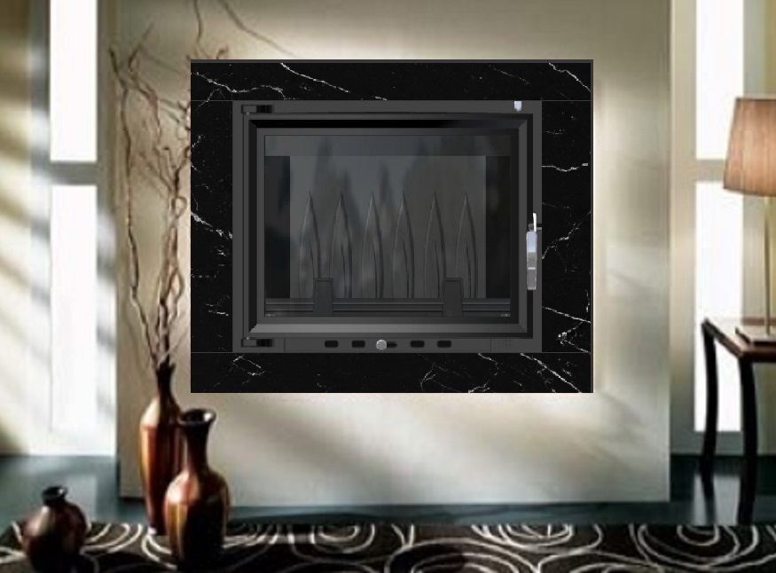 Kominek - zestaw: wkład kominkowy EKO 8 kw + rama marmurowa Akwen czarna + akcesoria montażowe