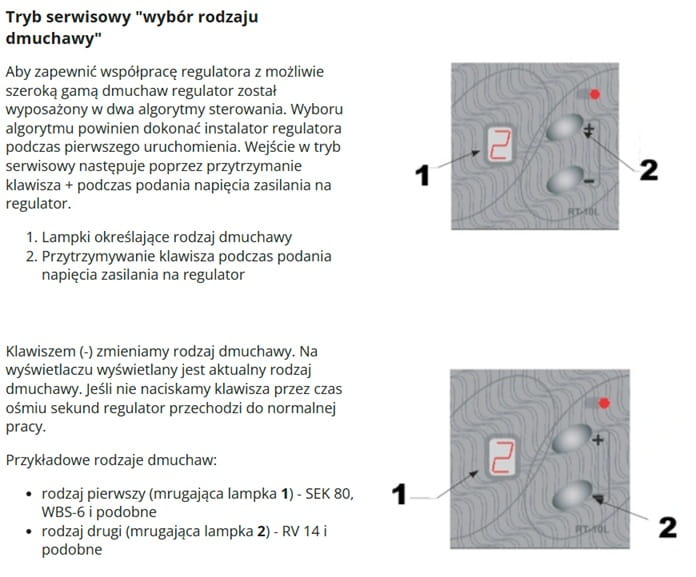 – W trybie serwisowym – możliwość doboru parametrów pracy regulatora pod kątem rodzaju silniki stosowanego w wentylatorze