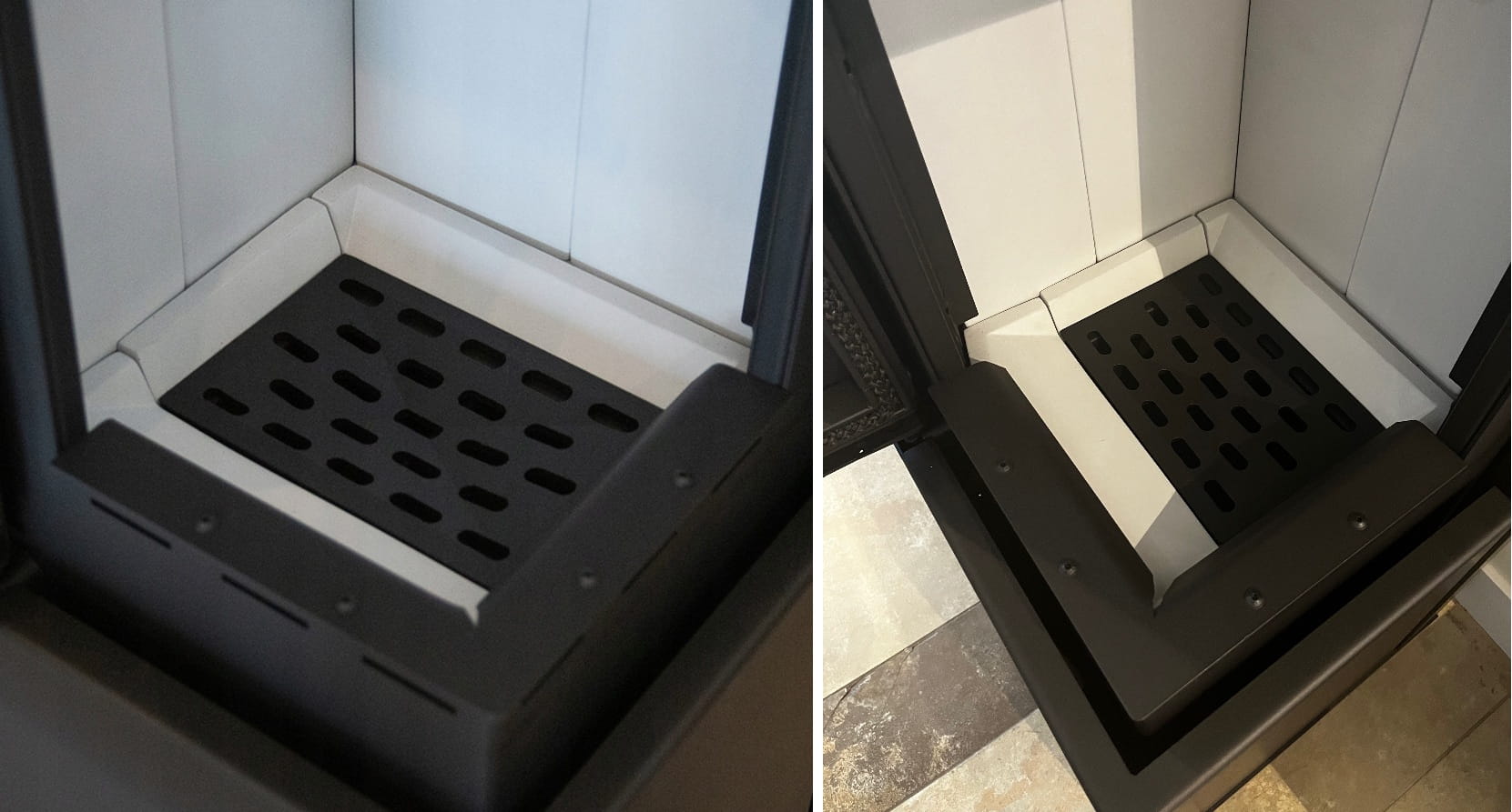 W formie zbiornika umieszczonego poniżej żeliwnego rusztu. Umożliwia wygodne i szybkie usuwanie popiołu z kominka.
