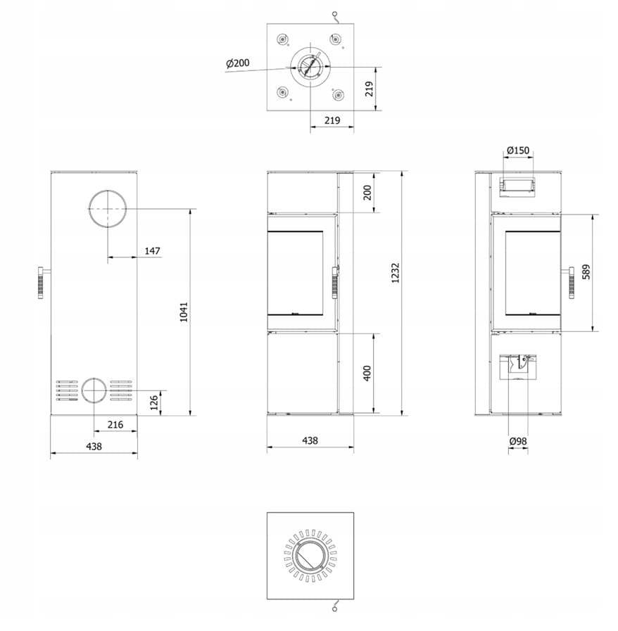 - Regulowany wylot spalin: montażowych, z tyłu lub na górze pieca