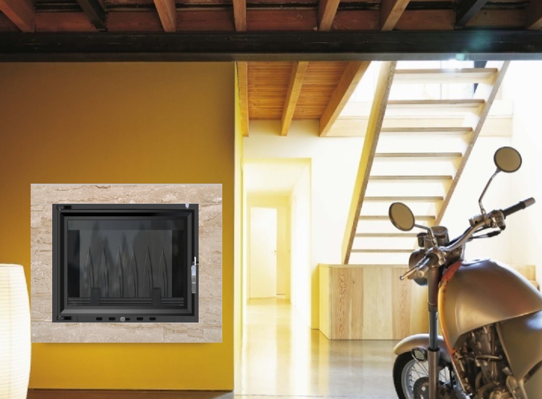 Kominek nowoczesny o pięknych panoramicznych proporcjach paleniska wykończony ramą kamienną idealnie nadaje się do niewielkich salonów