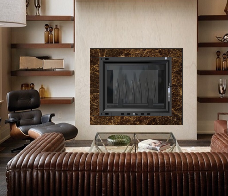 Kominek nowoczesny o pięknych panoramicznych proporcjach paleniska wykończony ramą kamienną idealnie nadaje się do niewielkich salonów