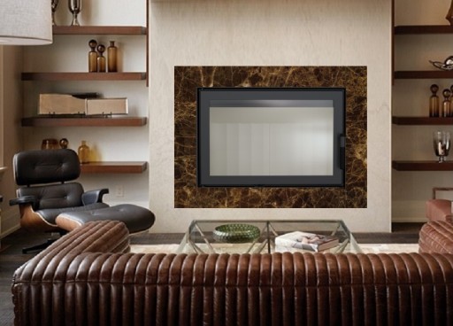 Kominek nowoczesny o pięknych panoramicznych proporcjach paleniska wykończony ramą kamienną idealnie nadaje się do niewielkich salonów