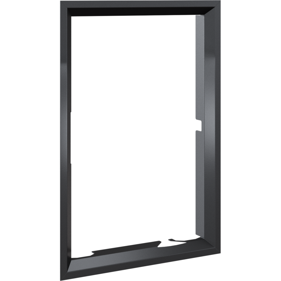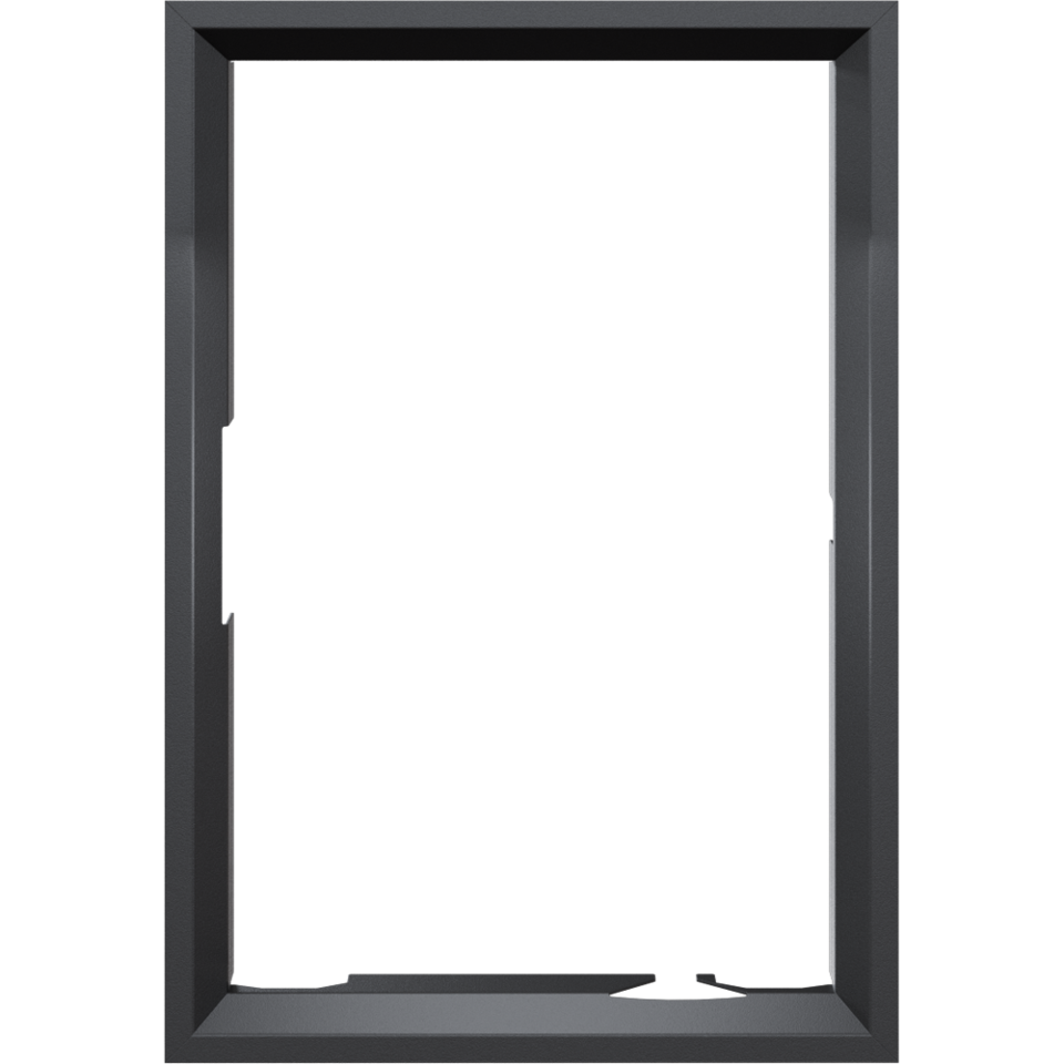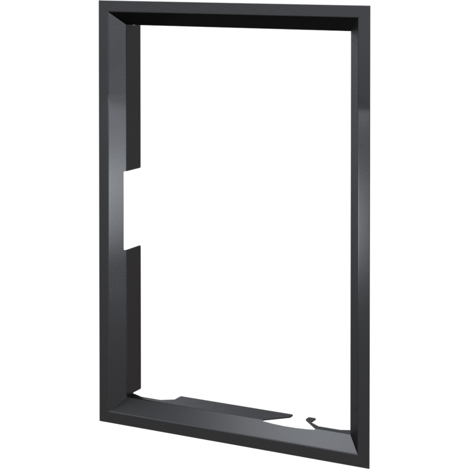 Nowoczesna stalowa ramka ozdobna do wkładu kominkowego NADIA 9 z prostym frontem oraz drzwiami otwieranymi prawostronnie (zawiasy po prawej stronie) po przełożeniu drzwi.