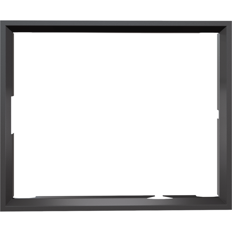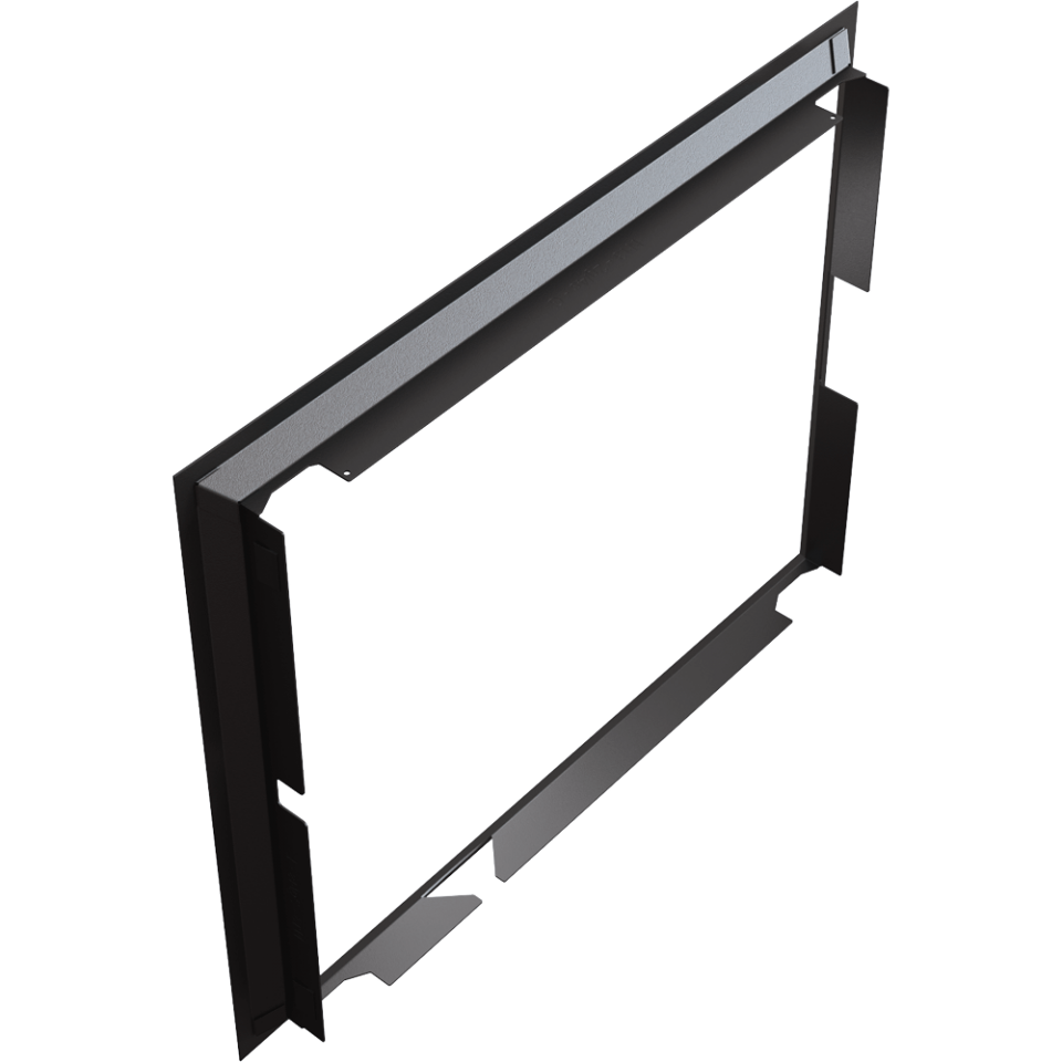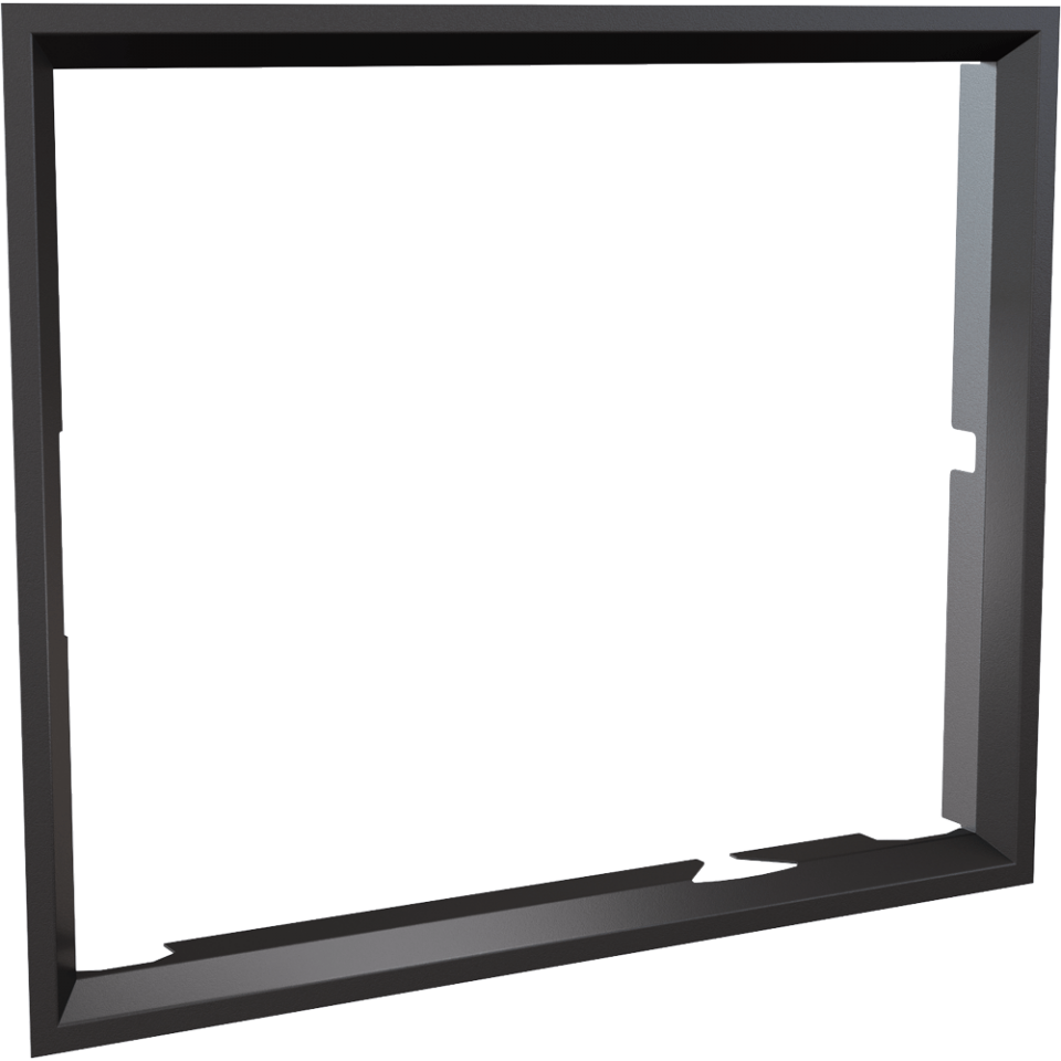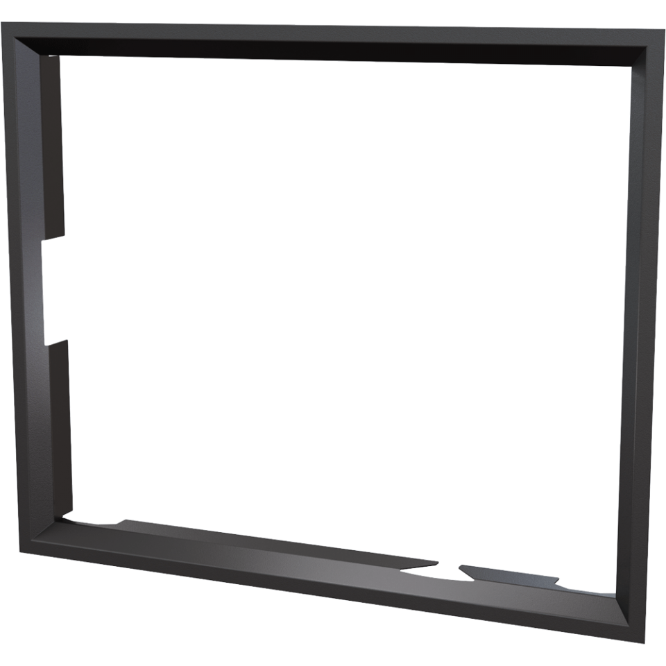 Nowoczesna stalowa ramka ozdobna do wkładu kominkowego NADIA 13 z prostym frontem oraz drzwiami otwieranymi prawostronnie (zawiasy po prawej stronie) po przełożeniu drzwi.