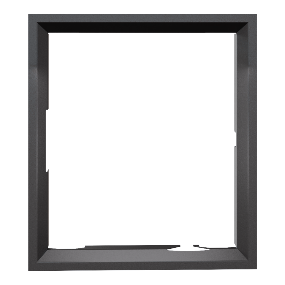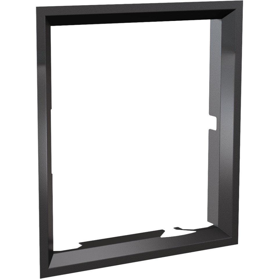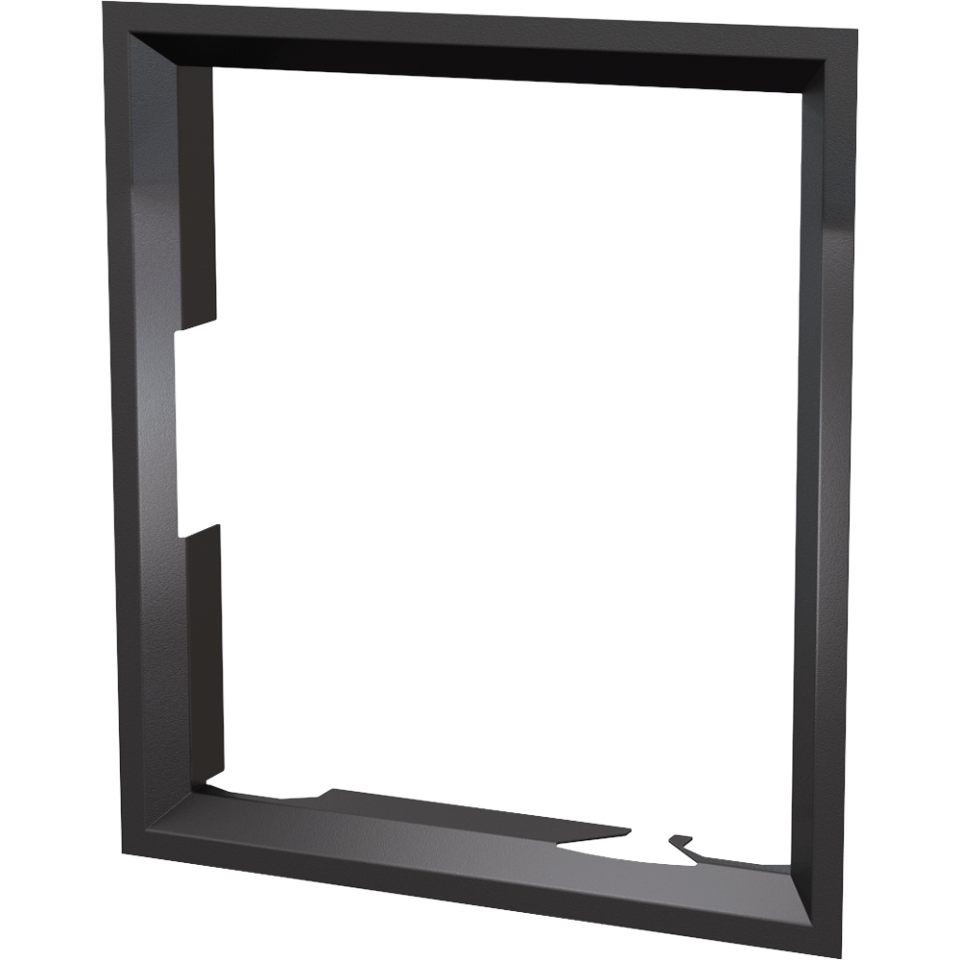 Nowoczesna stalowa ramka ozdobna do wkładu kominkowego NADIA 8 z prostym frontem oraz drzwiami otwieranymi prawostronnie (zawiasy po prawej stronie) po przełożeniu drzwi.