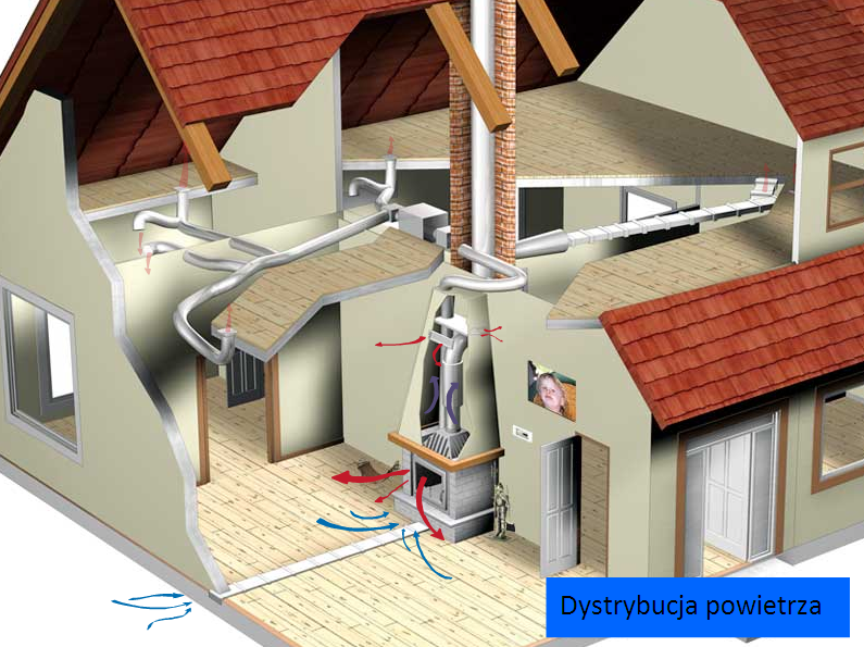 w sposób grawitacyjny lub mechaniczny z kominka. Stosuje się go w pomieszczeniach o dużej różnicy temperatur