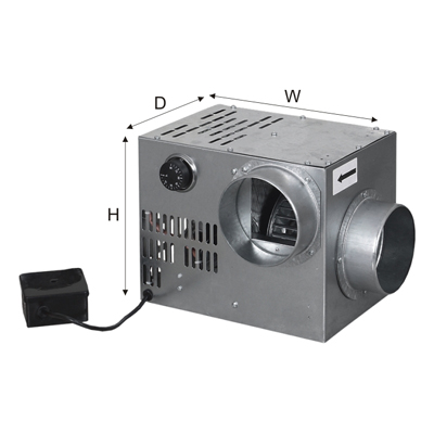 Wentylator składa się z korpusu, króćców wejściowego i wyjściowego (średnice wejściowa i wyjściowa powinny odpowiadać średnicy instalowanego przewodu), regulatora temperatury (zakres regulacji temperatury 0-90 *C), puszki dla podłączenia wentylatora do sieci jednofazowej. Kierunek przepływu powietrza musi zgadzać się z kierunkiem wskazanym przez strzałkę na obudowie wentylatora. Instalację wentylatora można dokonać w odległości nie mniejszej niż 1,5 m od źródła ciepła. Połączyć przewody powietrzne o odpowiedniej średnicy do wentylatora i zamocować je za pomocą opasek zaciskowych.