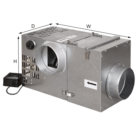 Wentylator składa się z korpusu, króćców wejściowego i wyjściowego (średnice wejściowa i wyjściowa powinny odpowiadać średnicy instalowanego przewodu), regulatora temperatury (zakres regulacji temperatury 0-90 *C), puszki dla podłączenia wentylatora do sieci jednofazowej. Kierunek przepływu powietrza musi zgadzać się z kierunkiem wskazanym przez strzałkę na obudowie wentylatora. Instalację wentylatora można dokonać w odległości nie mniejszej niż 1,5 m od źródła ciepła. Połączyć przewody powietrzne o odpowiedniej średnicy do wentylatora i zamocować je za pomocą opasek zaciskowych.