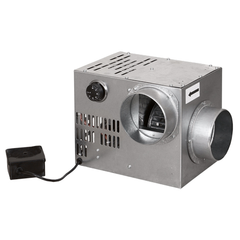Wentylator składa się z korpusu, króćców wejściowego i wyjściowego (średnice wejściowa i wyjściowa powinny odpowiadać średnicy instalowanego przewodu), regulatora temperatury (zakres regulacji temperatury 0-90 *C), puszki dla podłączenia wentylatora do sieci jednofazowej. Kierunek przepływu powietrza musi zgadzać się z kierunkiem wskazanym przez strzałkę na obudowie wentylatora. Instalację wentylatora można dokonać w odległości nie mniejszej niż 1,5 m od źródła ciepła. Połączyć przewody powietrzne o odpowiedniej średnicy do wentylatora i zamocować je za pomocą opasek zaciskowych.