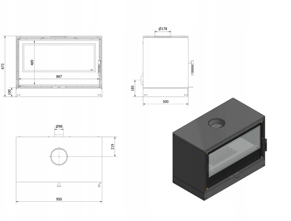 Wkład kominkowy Kaseta Piec wolnostojący KARI 95 w zabudowie z wylotem spalin fi 180 + dolot, moc 14kW