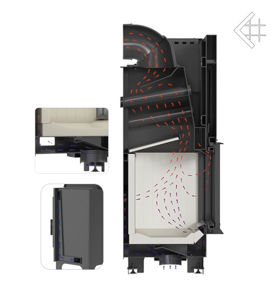 - Wkład posiada rownież kurtynę powietrzną - system czystej szyby bez pobierania powietrza z pomieszczenia. Powietrze dostarczane jest specjalnymi kanałami na bokach kominka do komory znajdującej się w górnej części wkładu i równomiernie rozprowadzane na szybę na całej jej szerokości. Powietrze skierowane przez kierownicę "omiata" szybę powodując odsuwanie od niej ognia i dymu, co znacznie ogranicza osadzanie się na niej sadzy, dzięki czemu pozostaje ona czysta.