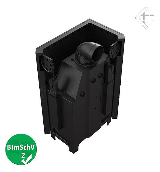 - Dopowietrzenie wtórne komory spalania realizowane jest przez otwory w tylnej ścianie - system dopalania spalin, odpowiada za ograniczenie emisji szkodliwych substancji do środowiska oraz podniesienie sprawność wkładu.