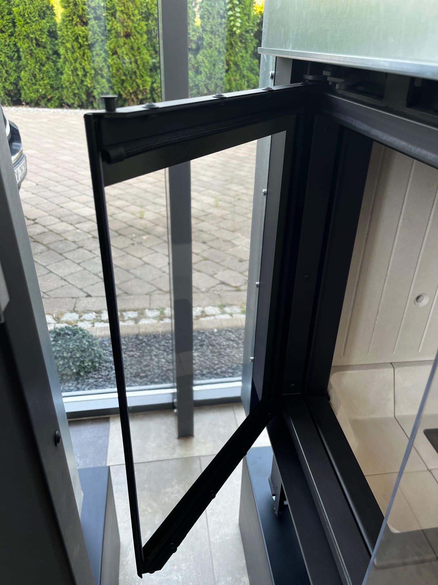 Podczas otwierania drzwi do góry, nie wchodzą one w obrys pomieszczenia, jak ma to miejsce w przypadku standardowych drzwi opartych na zawiasach i otwieranych na lewo lub prawo. Dzięki temu rozwiązaniu kominek zajmuje mniej przestrzeni, co zwiększa wygodę użytkowania i pozwala na lepsze zagospodarowanie wnętrza.