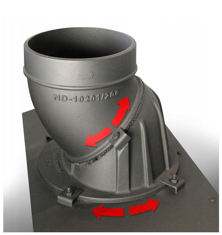 Możliwość zmiany ustawienia wylotu spalin, co ułatwia podłączenie wkładu. Regulacja ustawienia 360° daje możliwość podłączenia wylotu spalin z tyłu jak i na górze wkładu.