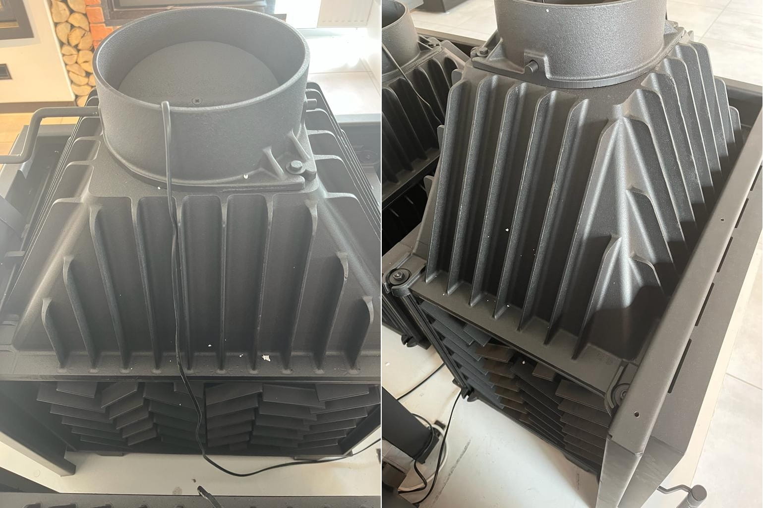 Maksymalne wykorzystanie ciepła odbywa się dzięki gęsto rozmieszczonym radiatorom na ścianach wkładu kominkowego.