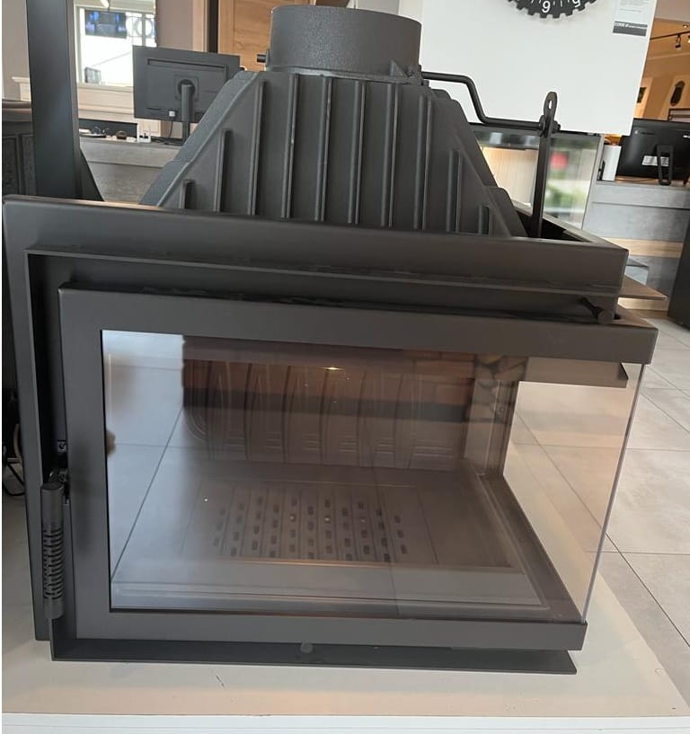 Narożny wkład kominkowy o drzwiach typu BS (szyby łączone). Dzięki takiemu rozwiązaniu możesz podziwiać ogień z dwóch stron w dwóch pomieszczeniach jednocześnie. Idealne rozwiązanie do łączonych pomieszczeń.