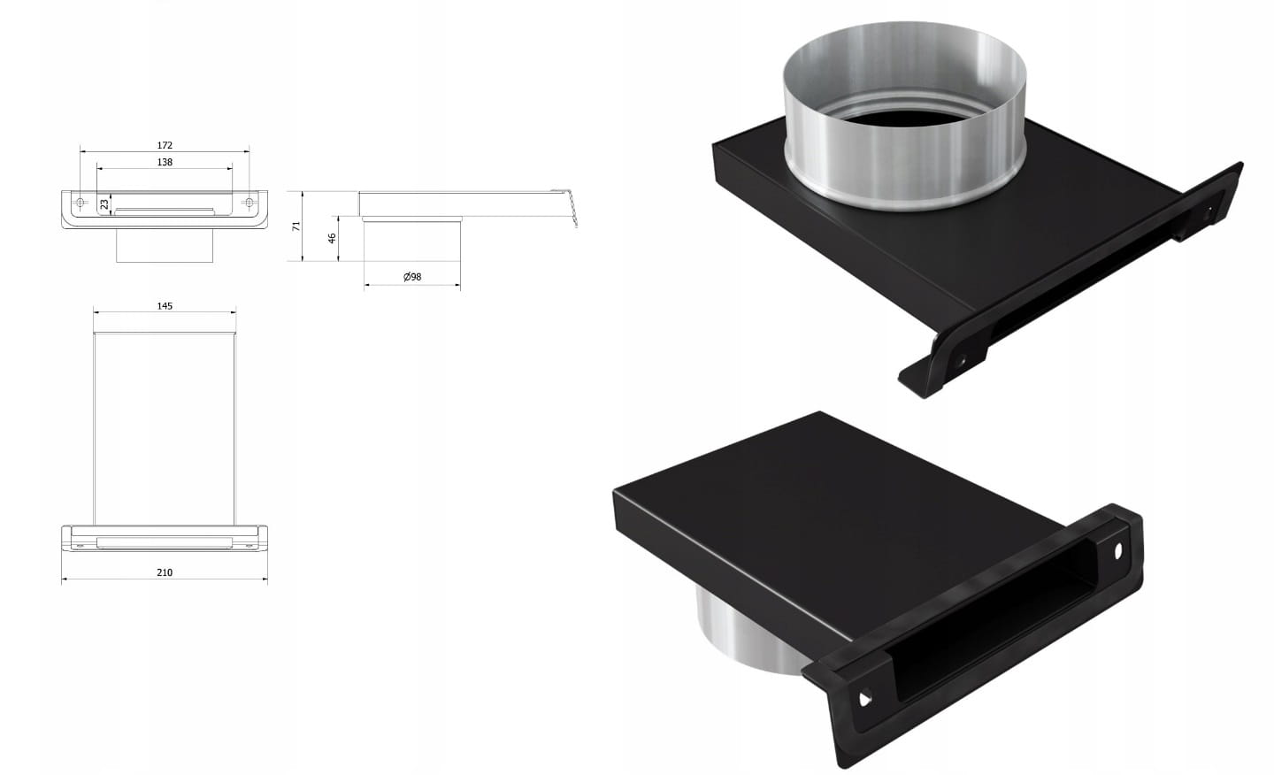 Dolot zimnego powietrza fi 100 do wkładów żeliwnych, który ma na celu doprowadzenie świeżego powietrza do paleniska z zewnątrz budynku. Nie wymaga montażu dodatkowego elementu: przejście dolot - rura. Montuje się go na dole z tyłu wkładu.
