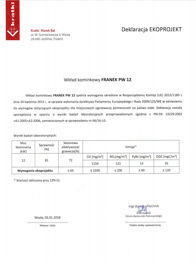 Dzięki swojej budowie oraz potrójnemu systemowi dopowietrzenia komory spalania wkład spełnia wymagania Ekoprojektu oraz normy BImSchV 2, wyznaczającej maksymalną emisję CO. Dodatkowo szczelna komora spalania sprawia, że jest on idealny do domów z rekuperatorami.