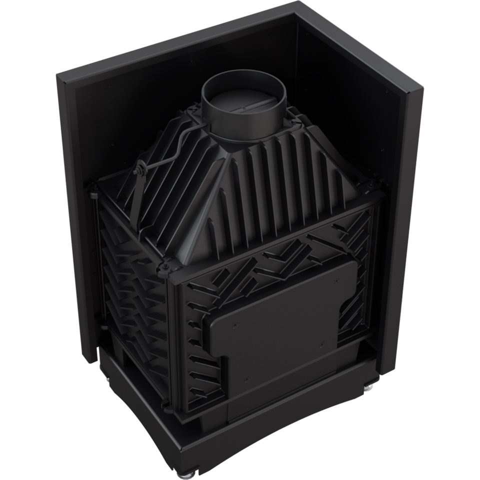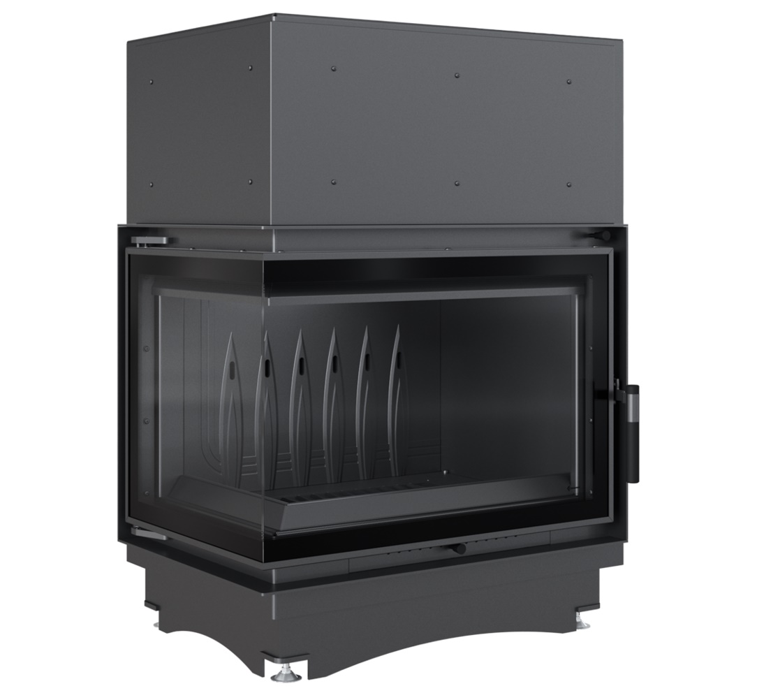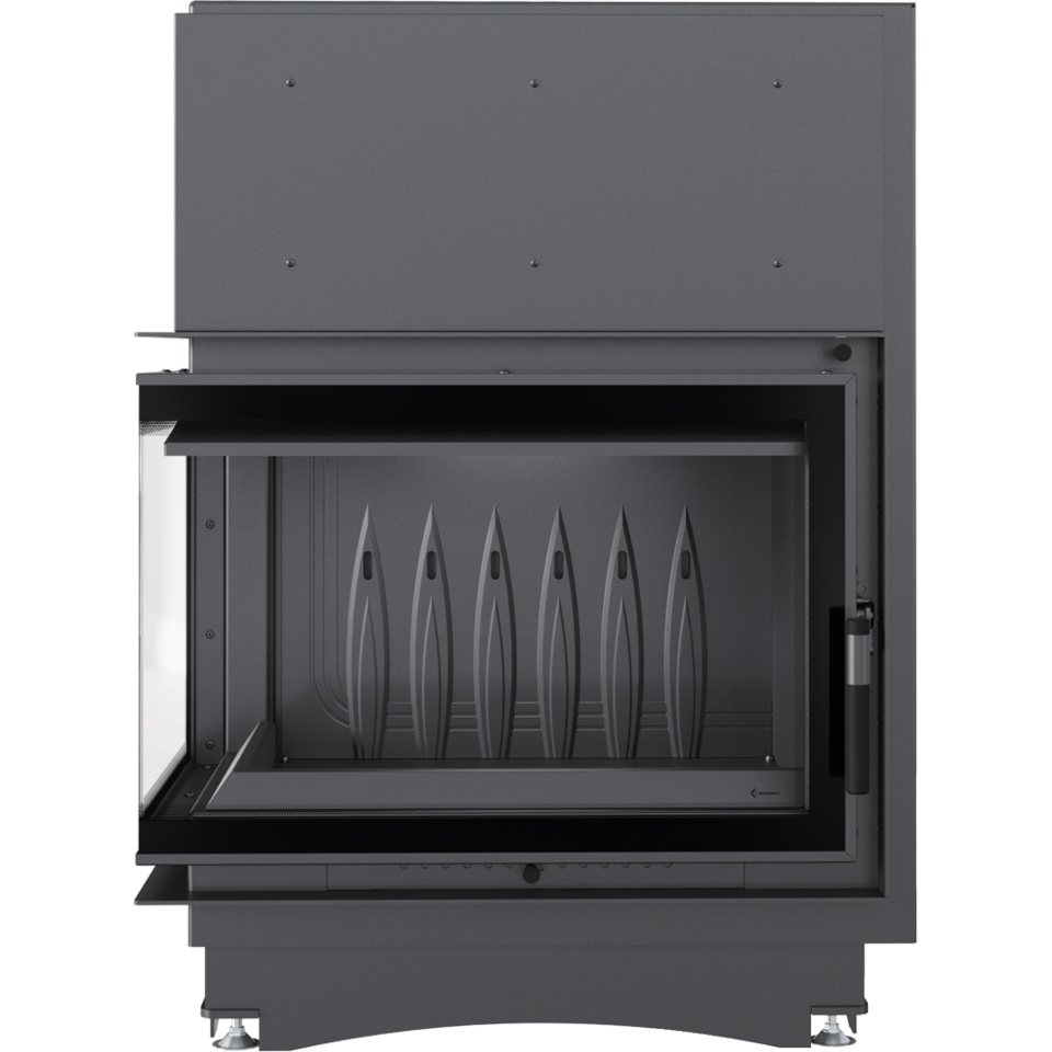 Nowoczesny front wkładu wykonany ze stali, wyposażony w dekoracyjną ceramikę żaroodporną wytrzymującą temperaturę do 800°C. Zamontowane szkło posiada certyfikat jakości i bezpieczeństwa. Ozdobna szyba typu glass, nie tylko wygląda elegancko i nowocześnie, ale przede wszystkim zastosowanie tego rozwiązania optycznie powiększa front wkładu i podkreśla wizję ognia. Rama drzwi wykonana jest z zamkniętego profilu, co sprawia, że są one stabilne i wytrzymałe na naprężenia występujące podczas pracy w wysokich temperaturach.