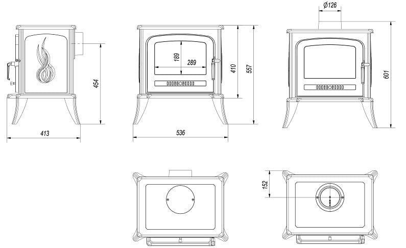 - Możliwość zamontowania wylotu spalin z tyłu lub na górze pieca.