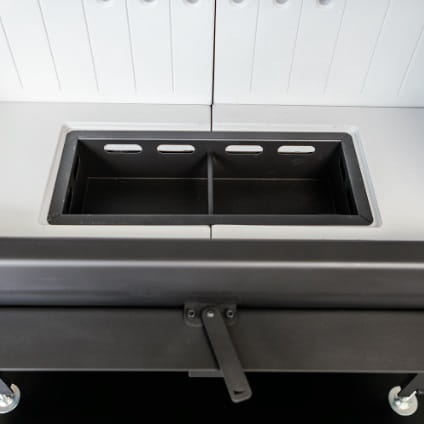 W formie zbiornika umieszczonego poniżej żeliwnego rusztu. Umożliwia wygodne i szybkie usuwanie popiołu z kominka.