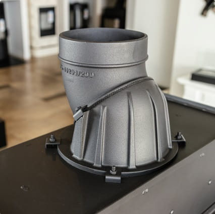 Model wyposażony w ruchomy wylot spalin, dzięki czemu w przypadku montażu, nie ma konieczności zakupu dodatkowych kolan. W łatwy sposób można dostosować kąt podłączenia wkładu do instalacji kominowej.