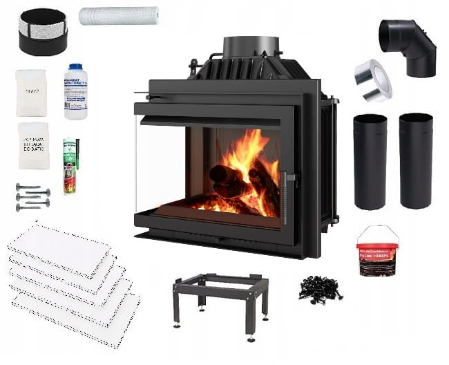 Narożny wkład kominkowy o drzwiach typu BS (szyby łączone). Dzięki takiemu rozwiązaniu możesz podziwiać ogień z dwóch stron w dwóch pomieszczeniach jednocześnie. Idealne rozwiązanie do łączonych pomieszczeń.