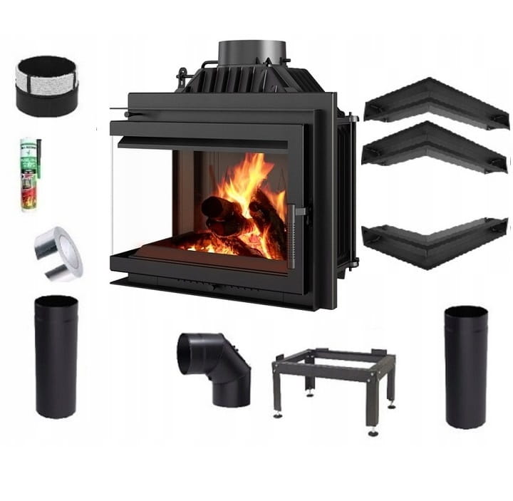 Narożny wkład kominkowy o drzwiach typu BS (szyby łączone). Dzięki takiemu rozwiązaniu możesz podziwiać ogień z dwóch stron w dwóch pomieszczeniach jednocześnie. Idealne rozwiązanie do łączonych pomieszczeń.