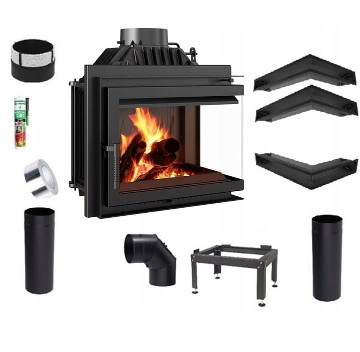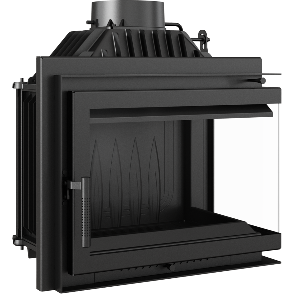 Narożny wkład kominkowy o drzwiach typu BS (szyby łączone). Dzięki takiemu rozwiązaniu możesz podziwiać ogień z dwóch stron w dwóch pomieszczeniach jednocześnie. Idealne rozwiązanie do łączonych pomieszczeń.