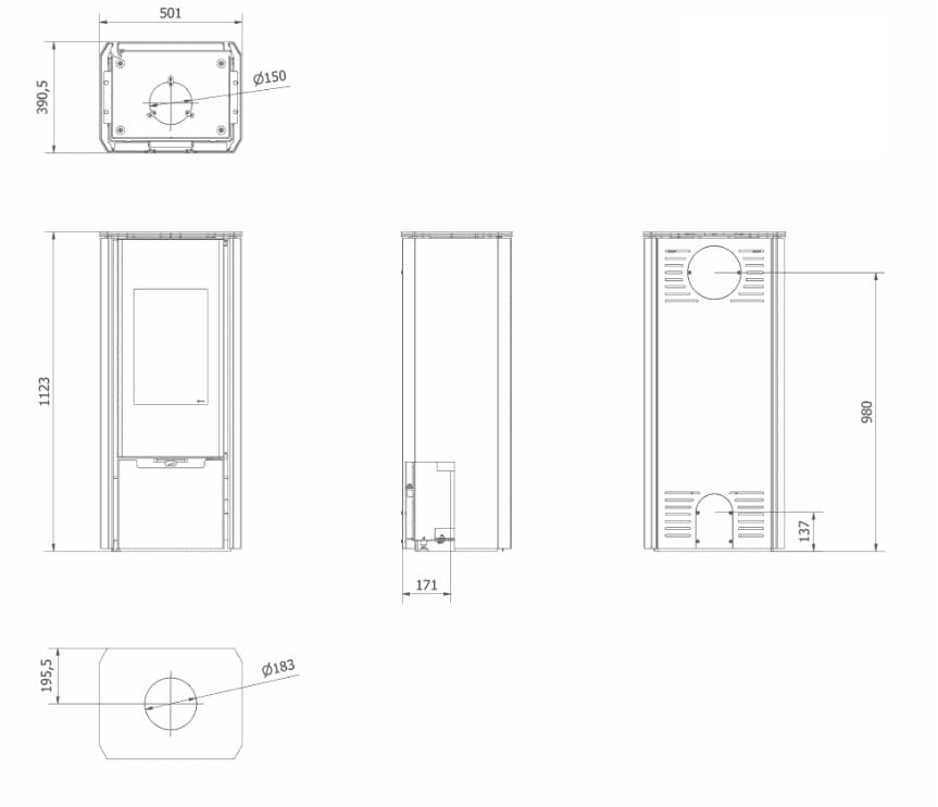 - Regulowany wylot spalin: montażowych, z tyłu lub na górze pieca