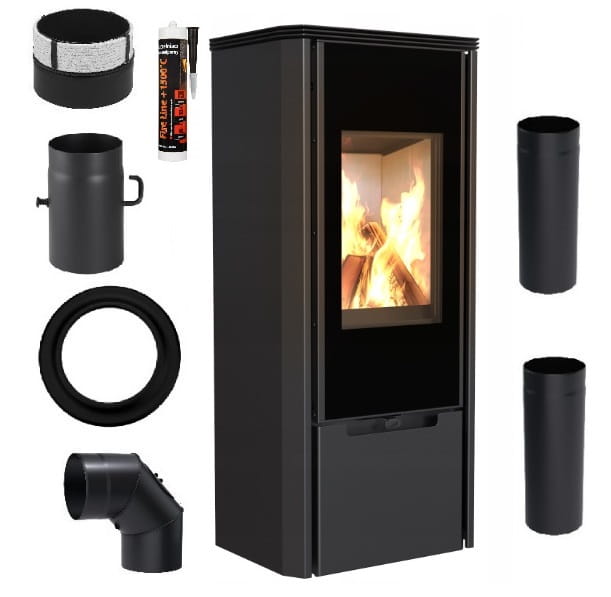 Zestaw 2: Piec wolnostojący ENYO glass + z wylotem spalin fi 150 + dolot, moc 8kW + akcesoria
