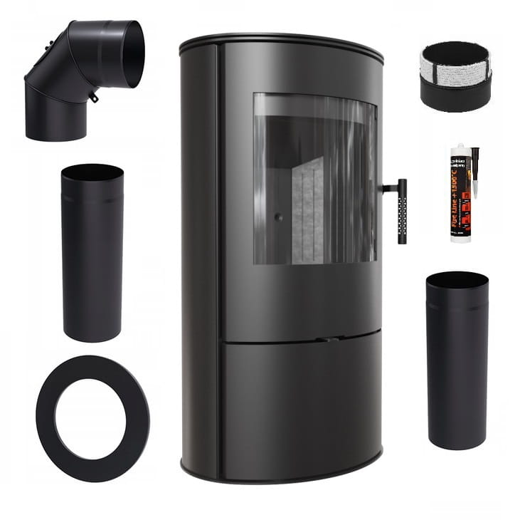 Zestaw 2: Piec wolnostojący Koza Rollo z czarnym TERMOTEC z wylotem spalin fi 150 + dolot, moc 7kW + akcesoria