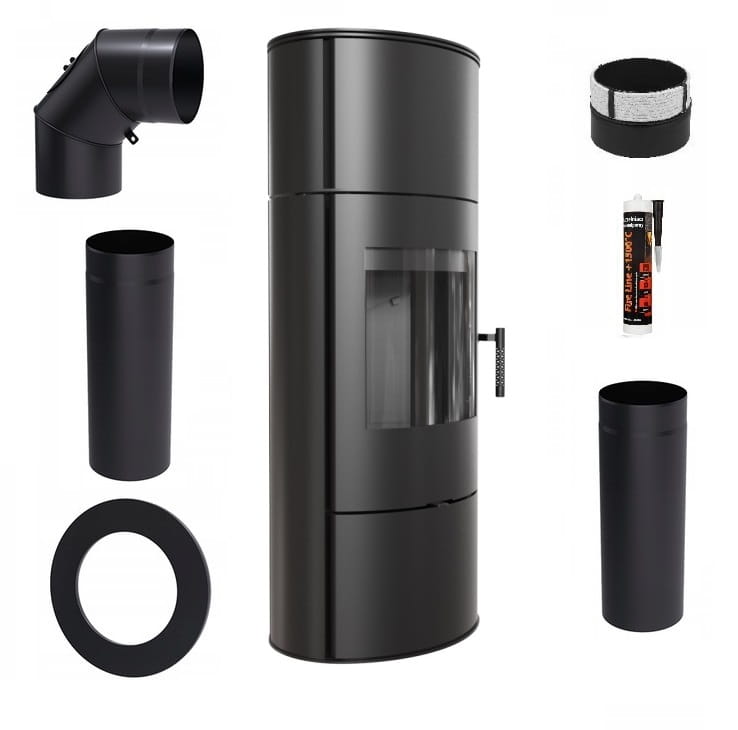 Zestaw 2: Piec wolnostojący Koza Rollo z krążkami akumulacyjnymi, czarny termotec, wylot spalin fi 150 + dolot, moc 7kW + akcesoria