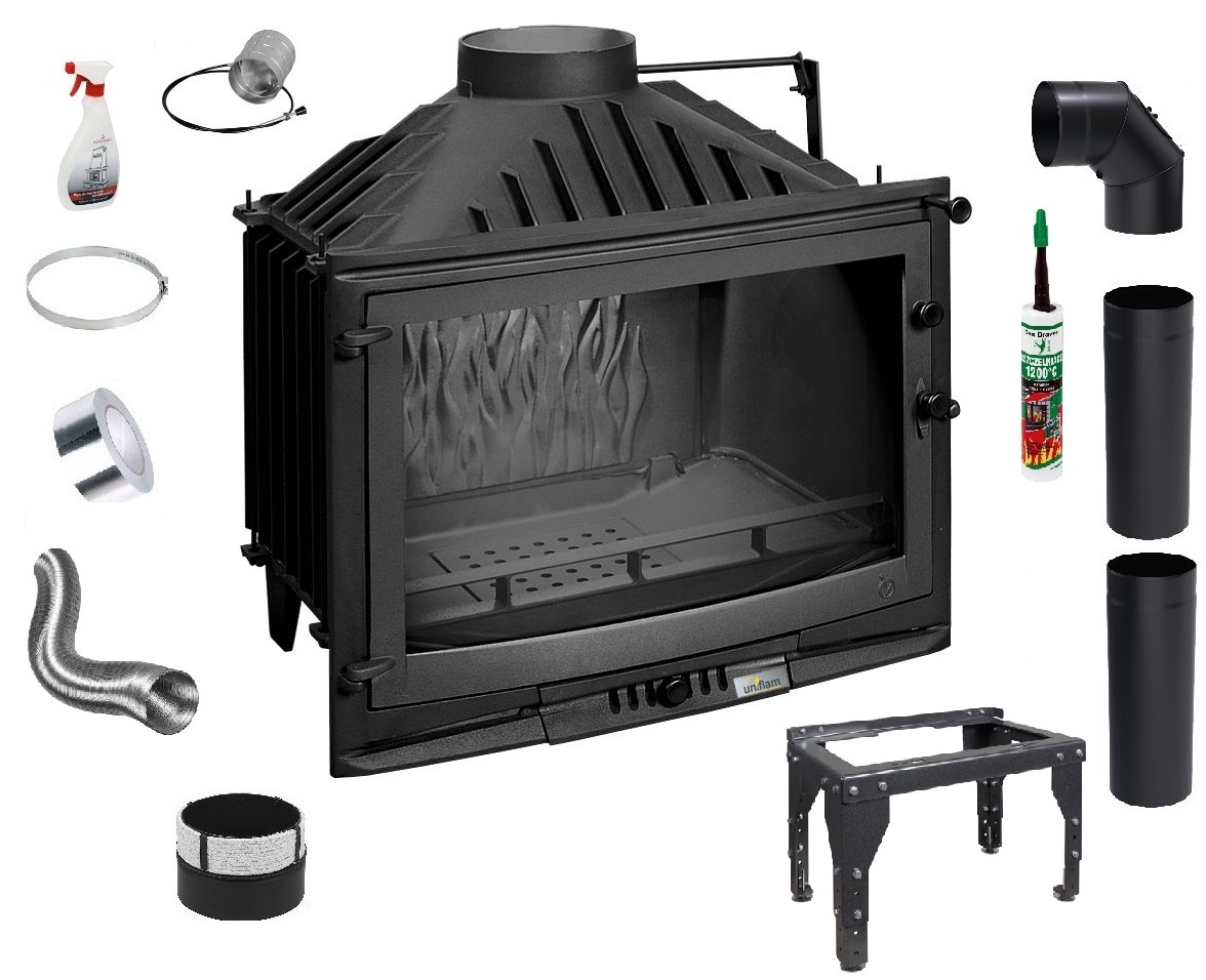 Zestaw 2: Wkład kominkowy powietrzny żeliwny UNIFLAM 700 Selenic ECO z szybrem, doprowadzenie powietrza moc 10kw + akcesoria