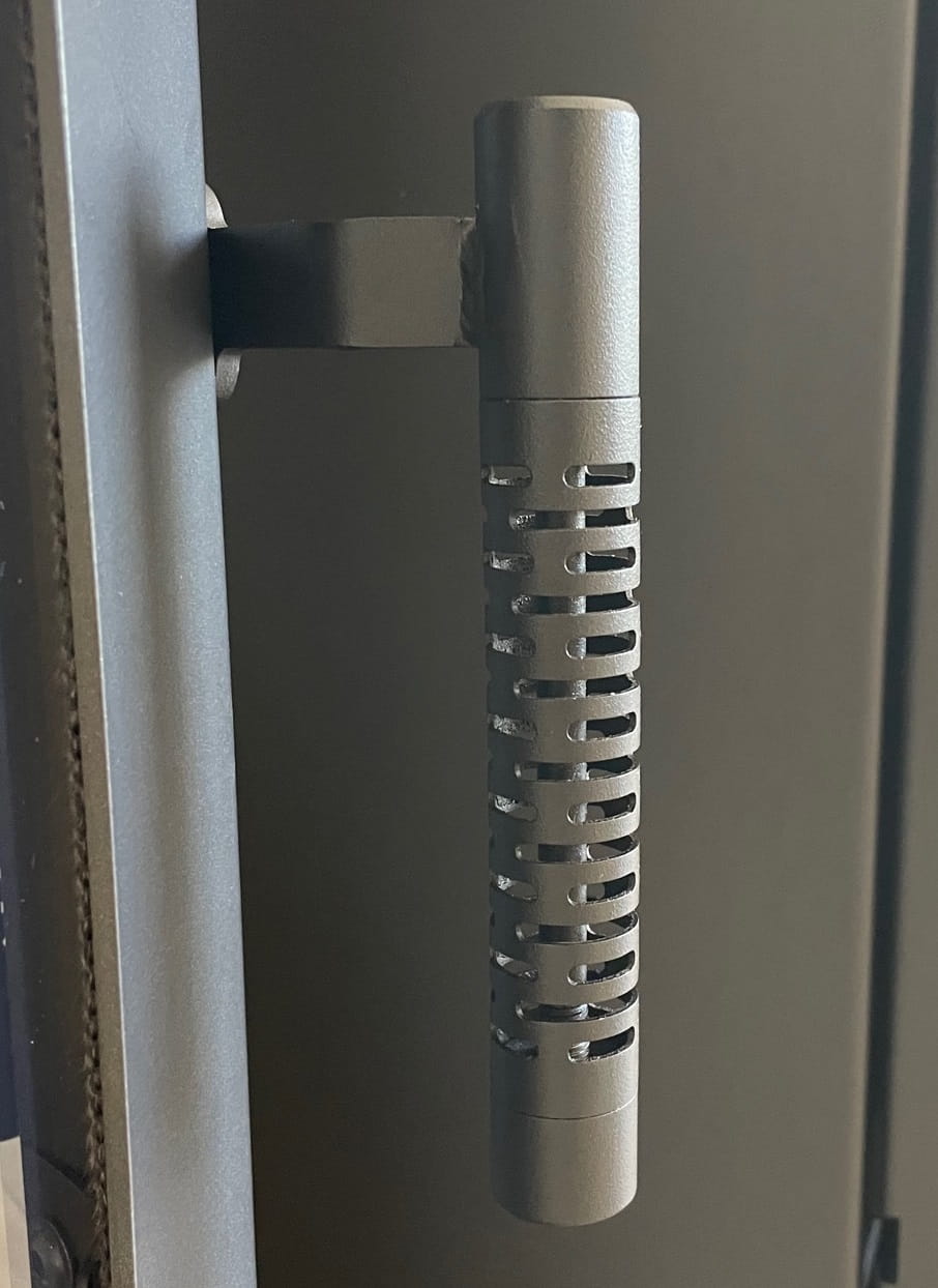 Drzwi wkładu posiadają nowoczesną klamkę. Jej specjalna perforowana konstrukcja powoduje naturalne schładzanie. Wygodna rękojeść gwarantuje wygodne otwieranie kominka.