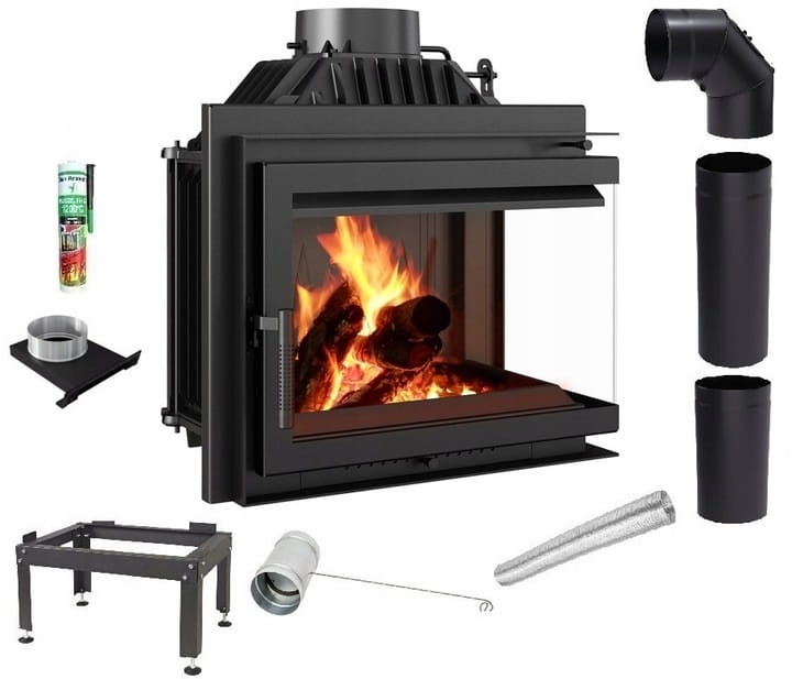 Narożny wkład kominkowy o drzwiach typu BS (szyby łączone). Dzięki takiemu rozwiązaniu możesz podziwiać ogień z dwóch stron w dwóch pomieszczeniach jednocześnie. Idealne rozwiązanie do łączonych pomieszczeń.