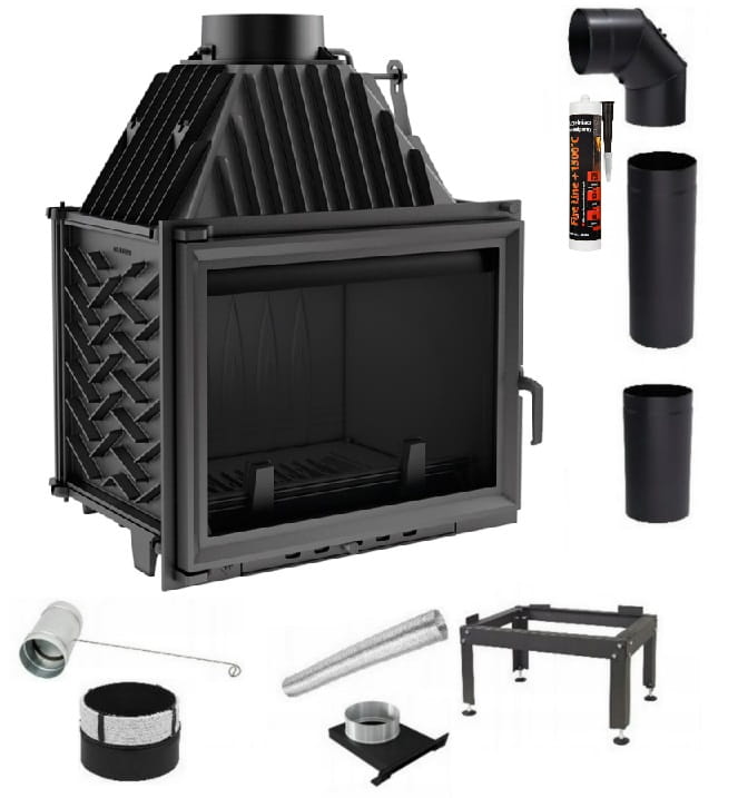 Zestaw 2: Wkład kominkowy powietrzny żeliwny z szybrem Zuzia + dolot, wylot fi 150, moc 15kw + akcesoria