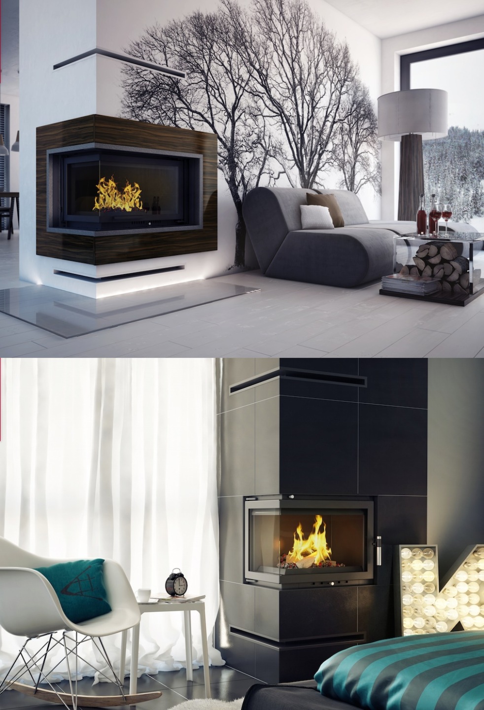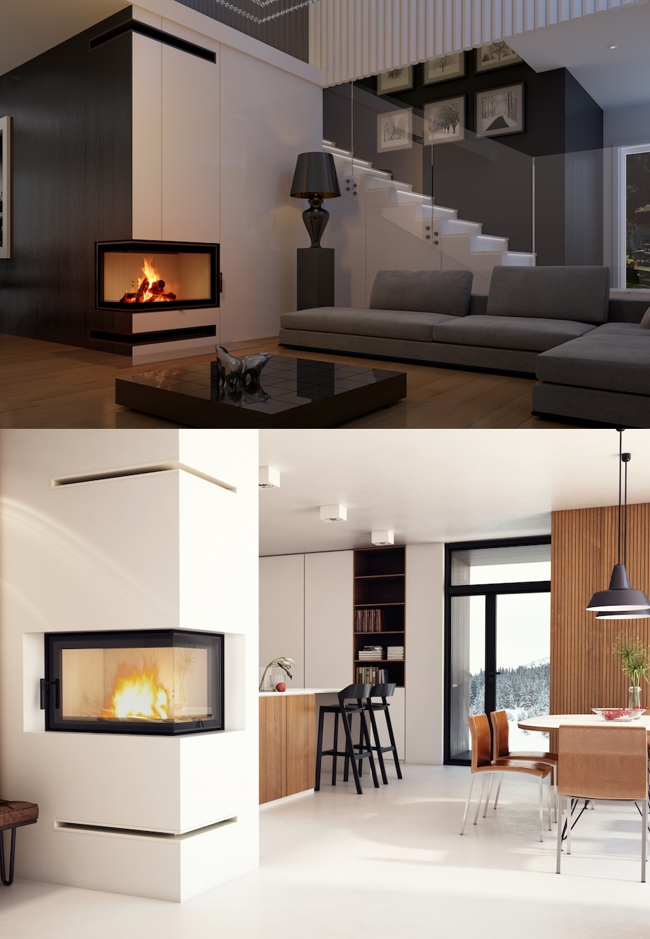 Przykładowe aranżacje kominków z użyciem kratek luft narożnych