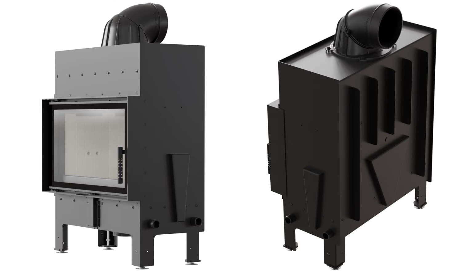Spawane króćce transportowe znacząco ułatwiają przeniesienie wkładu do miejsca instalacji. Uchwyty nie stanowią wyposażenia kominka.